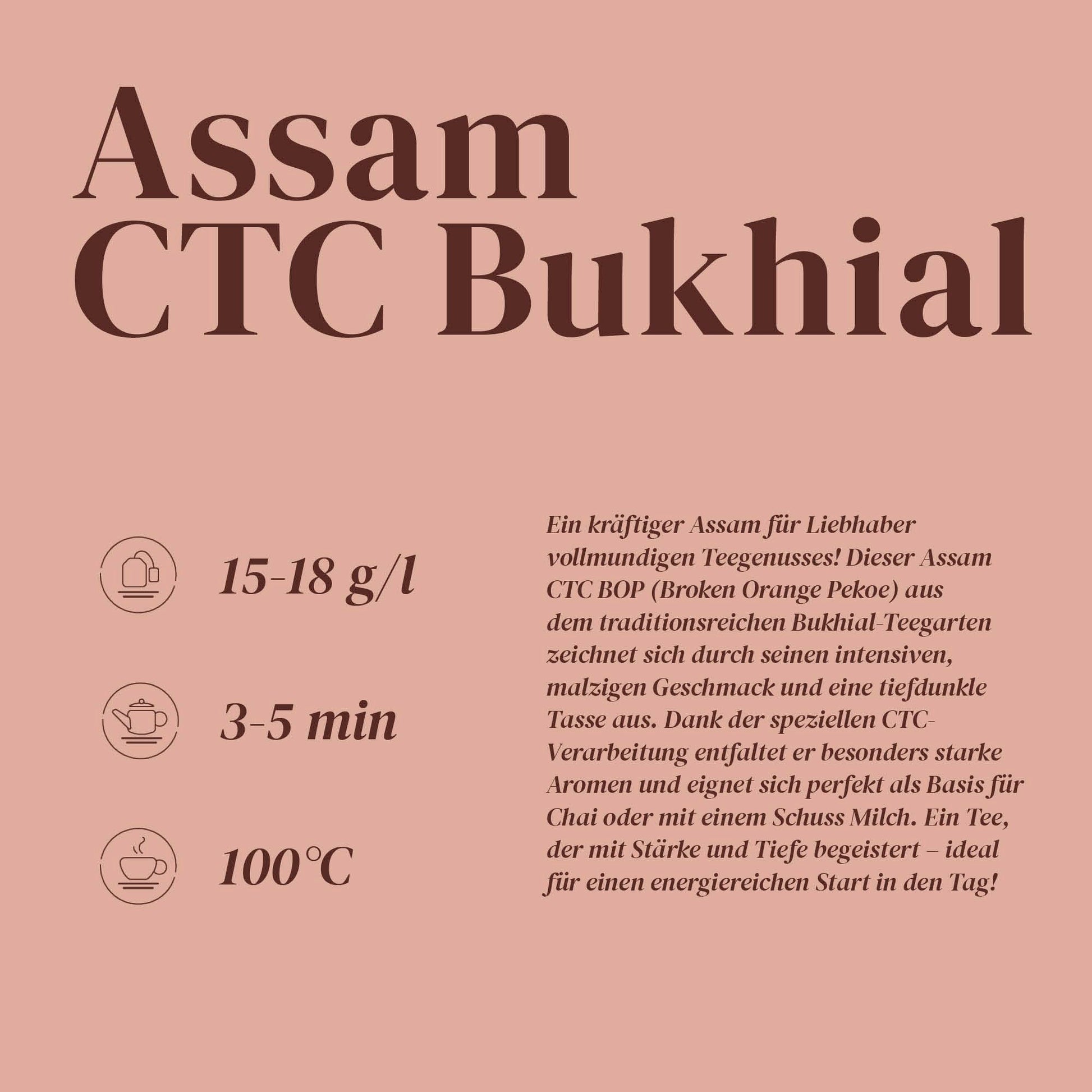 Unser Assam CTC Bukhial Schwarztee ist eine kraftvolle und aromatische Wahl, die besonders bei Liebhabern von starken Tees beliebt ist. CTC, die Abkürzung für "Crush, Tear, Curl", beschreibt das Produktionsverfahren, bei dem die Teeblätter zerkleinert, zerrissen und gerollt werden, was zu einem intensiven Geschmack führt.