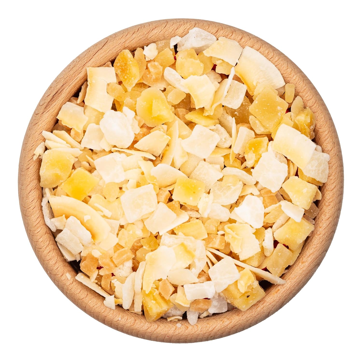 Aloe Vera Chunks (Aloe Vera, Zucker, Konservierungsmittel: SCHWEFELDIOXID), Mangostücke (Mango, Zucker, Säureregulator: Zitronensäure), kandierte Guavenstücke (Guave, Zucker, Säuerungsmittel: Zitronensäure, Apfelsäure; Salz, Festigungsmittel: Calciumchlorid), kandierte Ananasstücke (Ananas, Zucker, Säureregulator: Zitronensäure), gezuckerte und geröstete Kokoschips (Kokosnuss, Zucker), kandierte Ingwerstücke (Zucker, Ingwer, Antioxidationsmittel: Zitronensäure), natürliches Aroma.