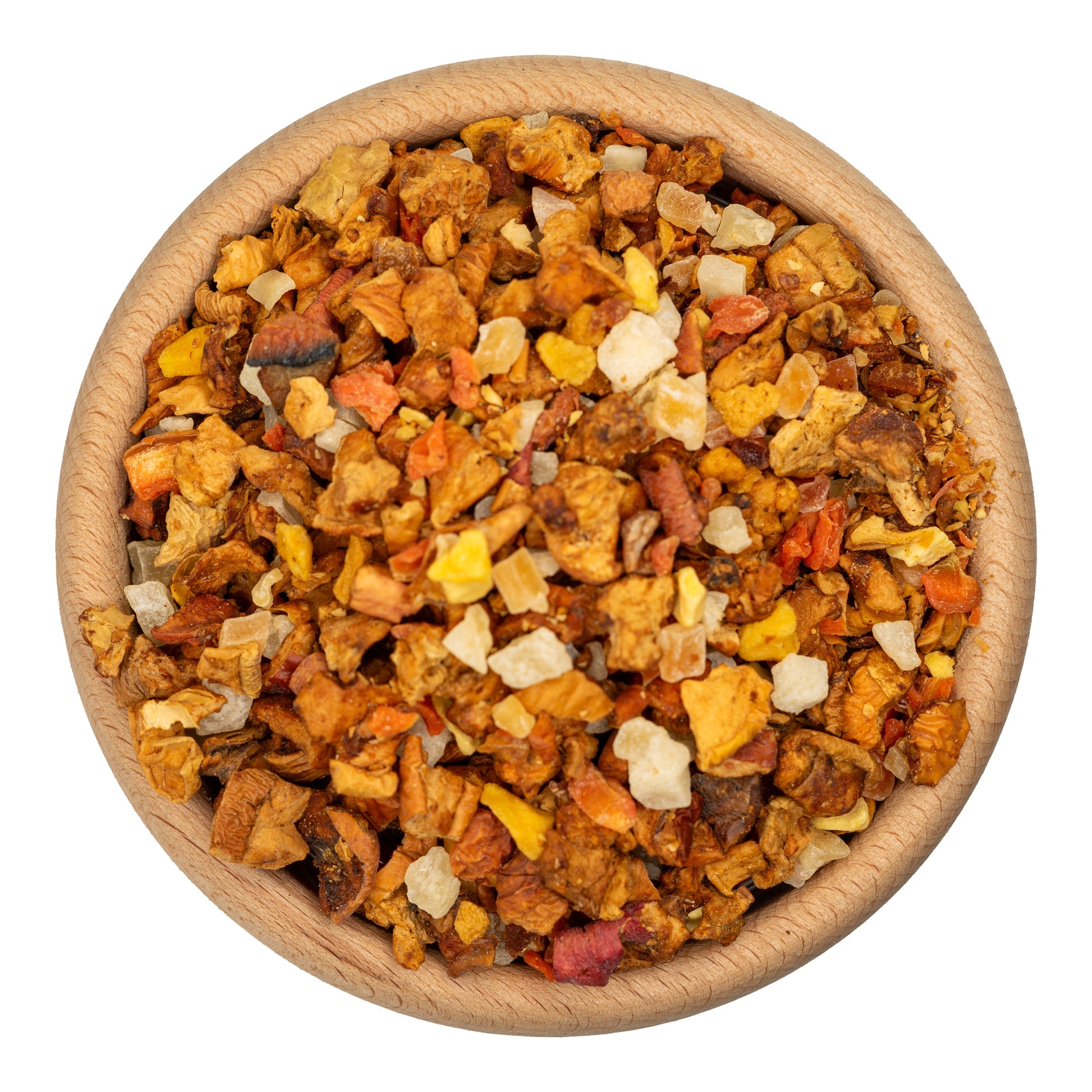 Unser Früchteteemischung mit Ananas Pfirsich Geschmack bietet ein herrlich exotisches Geschmackserlebnis, das die Frische sonnengereifter Ananas mit der samtigen Süße saftiger Pfirsiche vereint. Der erste Schluck überrascht mit der spritzigen, leicht säuerlichen Note der Ananas, die an tropische Strände erinnert. Im Nachklang entfaltet der Tee eine warme, fruchtige Sanftheit, die an den süßen Duft eines reifen Pfirsichs im Sommer erinnert. Eine harmonische Mischung aus Lebhaftigkeit und milder Süße, die sowohl heiß als auch kalt genossen ein belebender Genuss ist. Perfekt für alle, die sich eine kleine tropische Auszeit gönnen möchten.