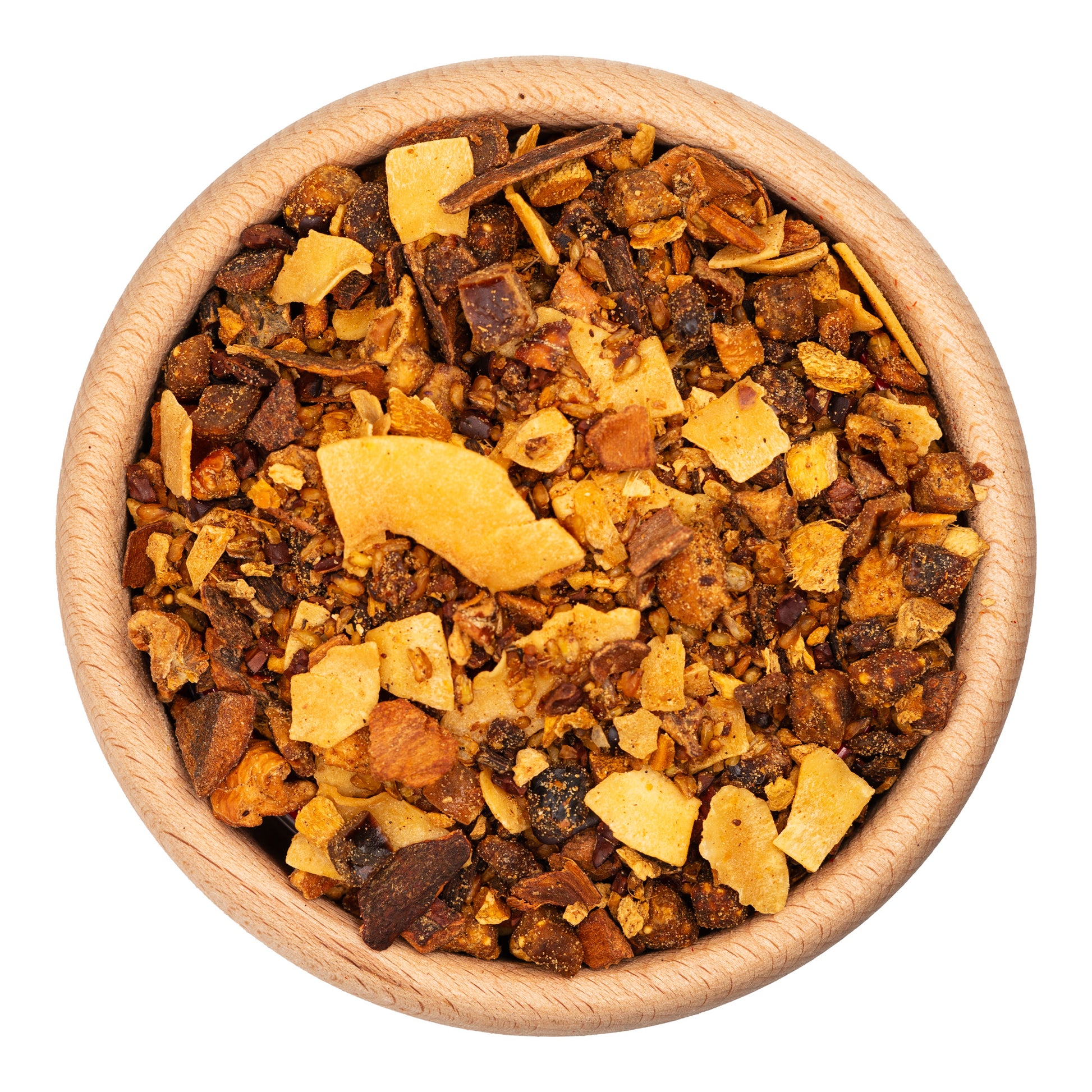 Dattelwürfel (Datteln, Reismehl) (20 %), Feigenwürfel (Feigen, Reismehl) (20 %), Cassiarinde, Apfelstücke, gezuckerte und geröstete Kokoschips (Kokosnuss, Zucker) (10 %), gerösteter Buchweizen, Ingwer (9 %), Kakaobohnenstücke, Aroma, natürliches Aroma, Vanille, natürliches Ingwer-Aroma, natürliches Kardamom-Aroma.