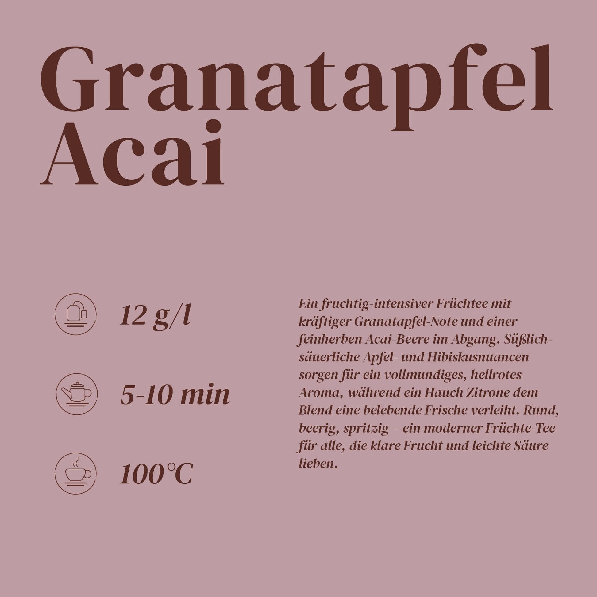 Unsere Früchteteemischung Granatapfel Acai fasziniert mit einer harmonischen Kombination aus dem intensiven Geschmack von Granatapfel und der exotischen Tiefe der Acai-Beere. Der erste Schluck entfaltet eine fruchtige Explosion: Die lebhafte Süße und die feine Säure des Granatapfels sorgen für eine erfrischende Vitalität, die von der samtigen, leicht erdigen Note der Acai-Beere perfekt ergänzt wird. Das Ergebnis ist eine ausgewogene Mischung, die kräftig und zugleich weich schmeckt – wie ein Spaziergang durch einen sommerlichen Beerenhain. Ob heiß genossen oder als kühler Eistee: Diese Mischung bringt pure Fruchtpower in jede Tasse!