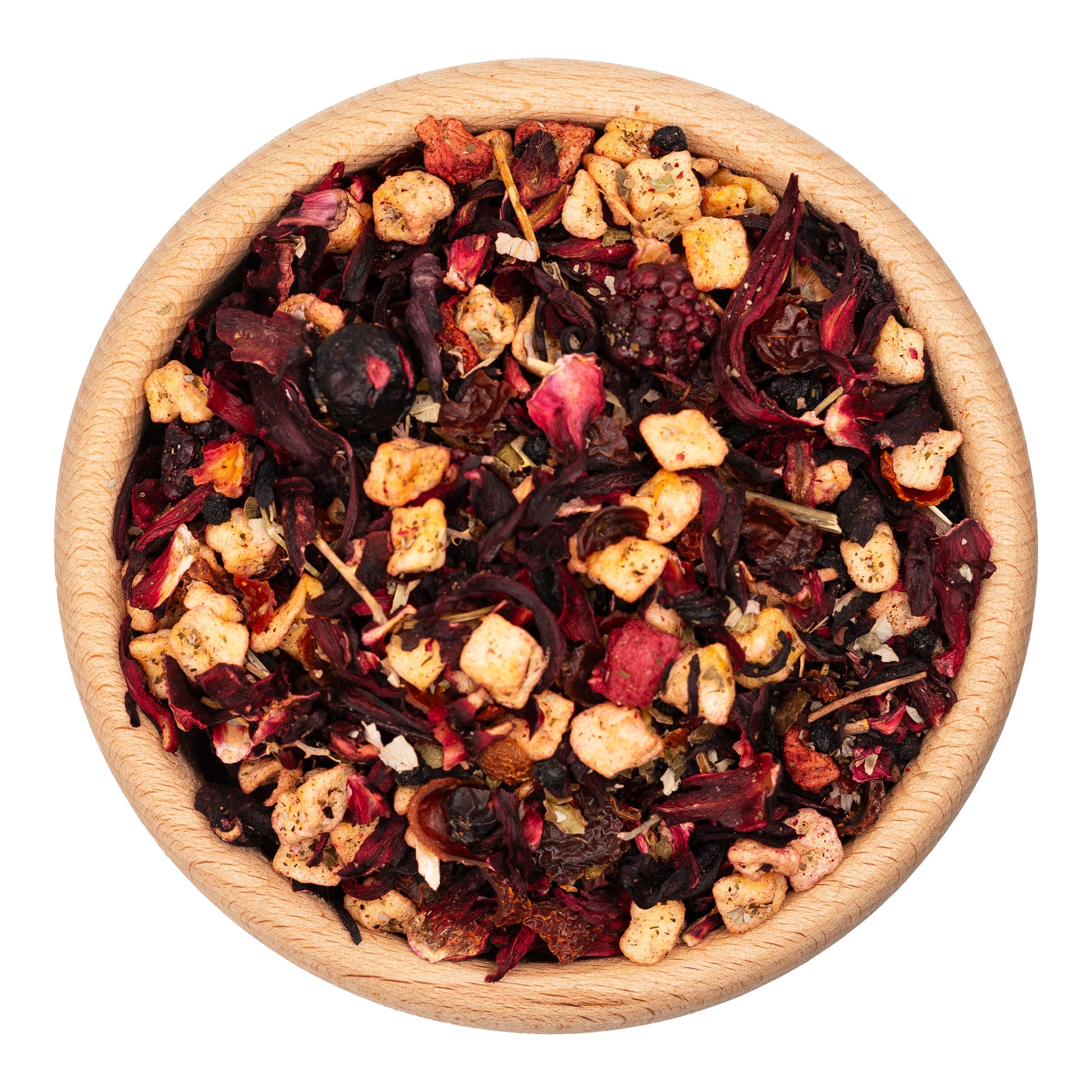 Hibiskus, Hagebutten, Apfelstücke, Holunderbeeren, Brombeerblätter, Aroma, süße Brombeerblätter, Brombeeren, Erdbeerstücke, schwarze Johannisbeeren, Himbeerfruchtgranulat (Glukosesirup, Zucker, Himbeeren, Verdickungsmittel: Natriumalginat).